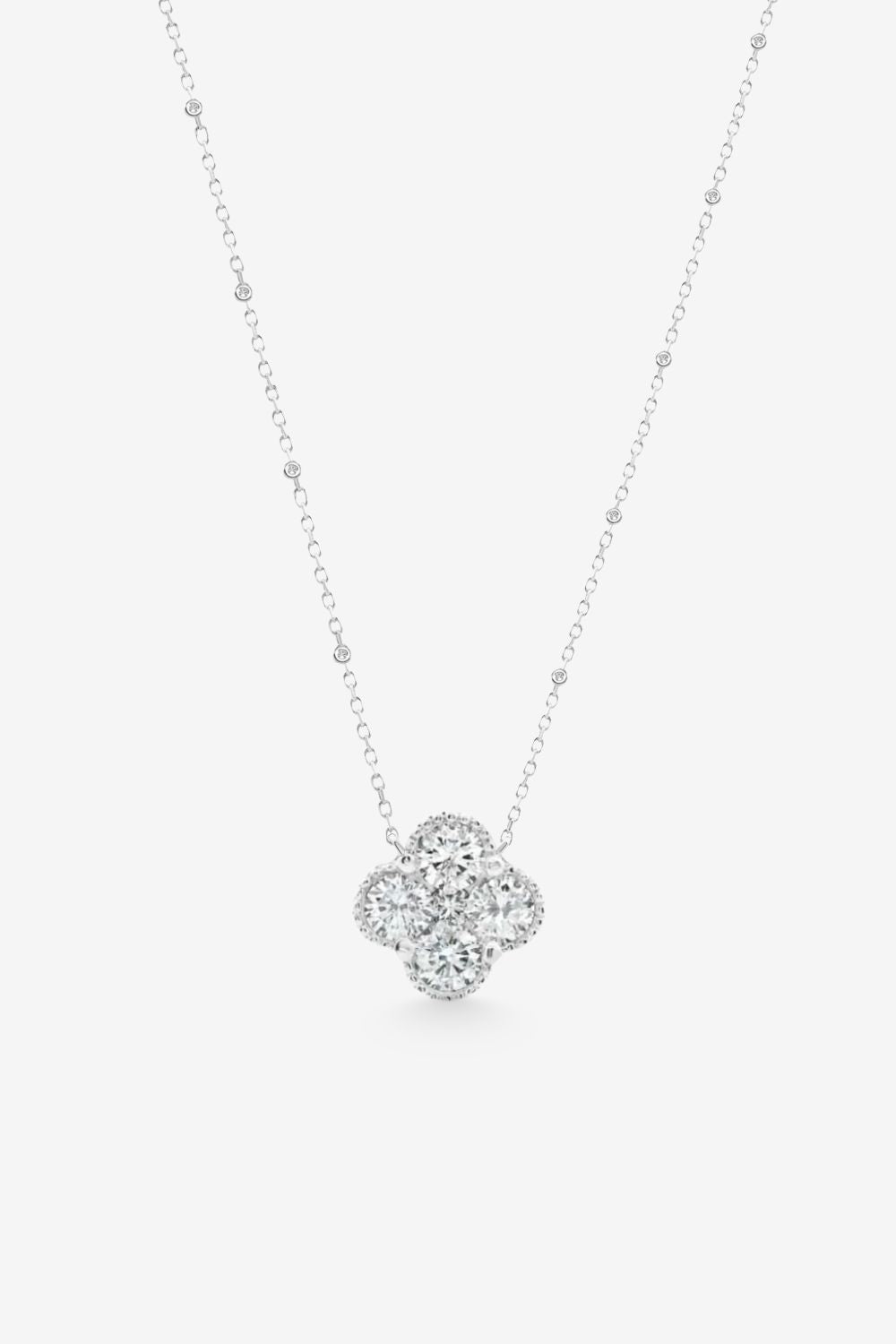 Design | Clover-shaped pendant with bezel-set diamonds along the chain.