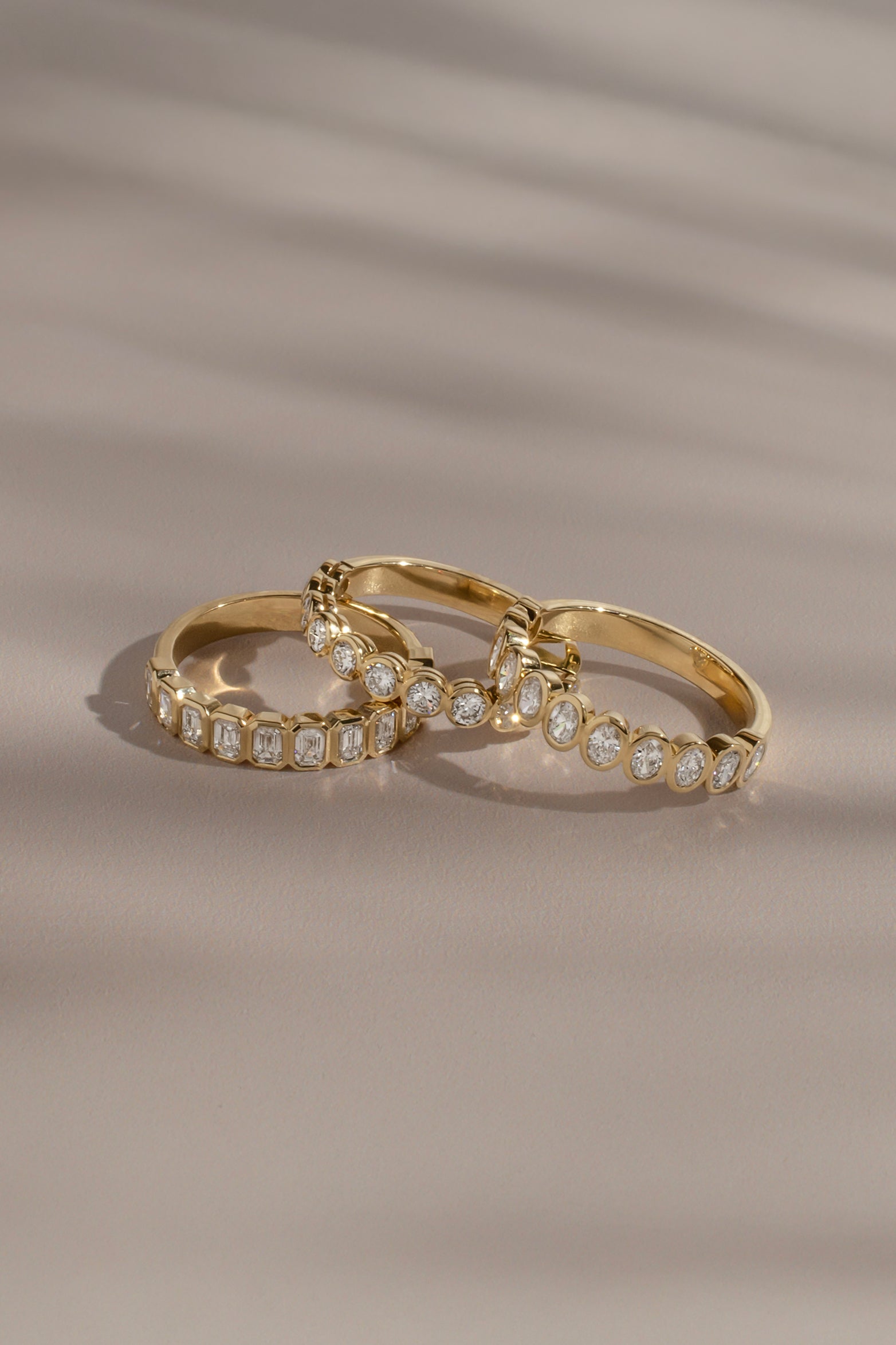 A refined arrangement of eleven natural round brilliant-cut diamonds, each set in a softly sculpted bezel of 18k yellow gold. With its balanced proportions, this ring offers a clean, modern interpretation of classic diamond detailing. Perfect worn with your engagement ring or alone, it brings beauty and clarity to any bridal or ring styling.