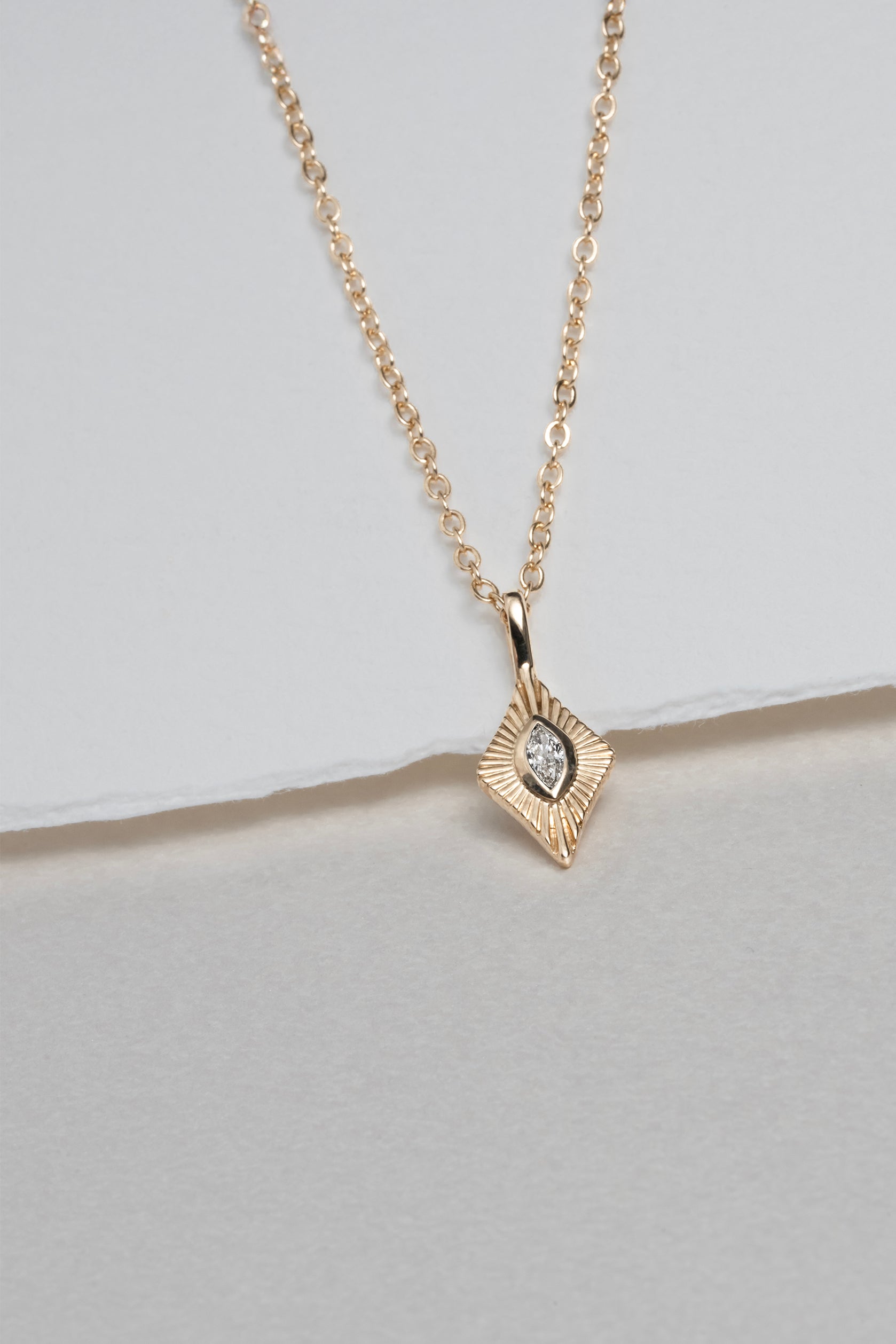 Crafted in 9k yellow gold, this pendant showcases a 0.11ct marquise-cut natural diamond with GH/SI clarity and color. Its elegant design makes it an ideal accessory for adding a touch of sophistication to everyday or special moments.