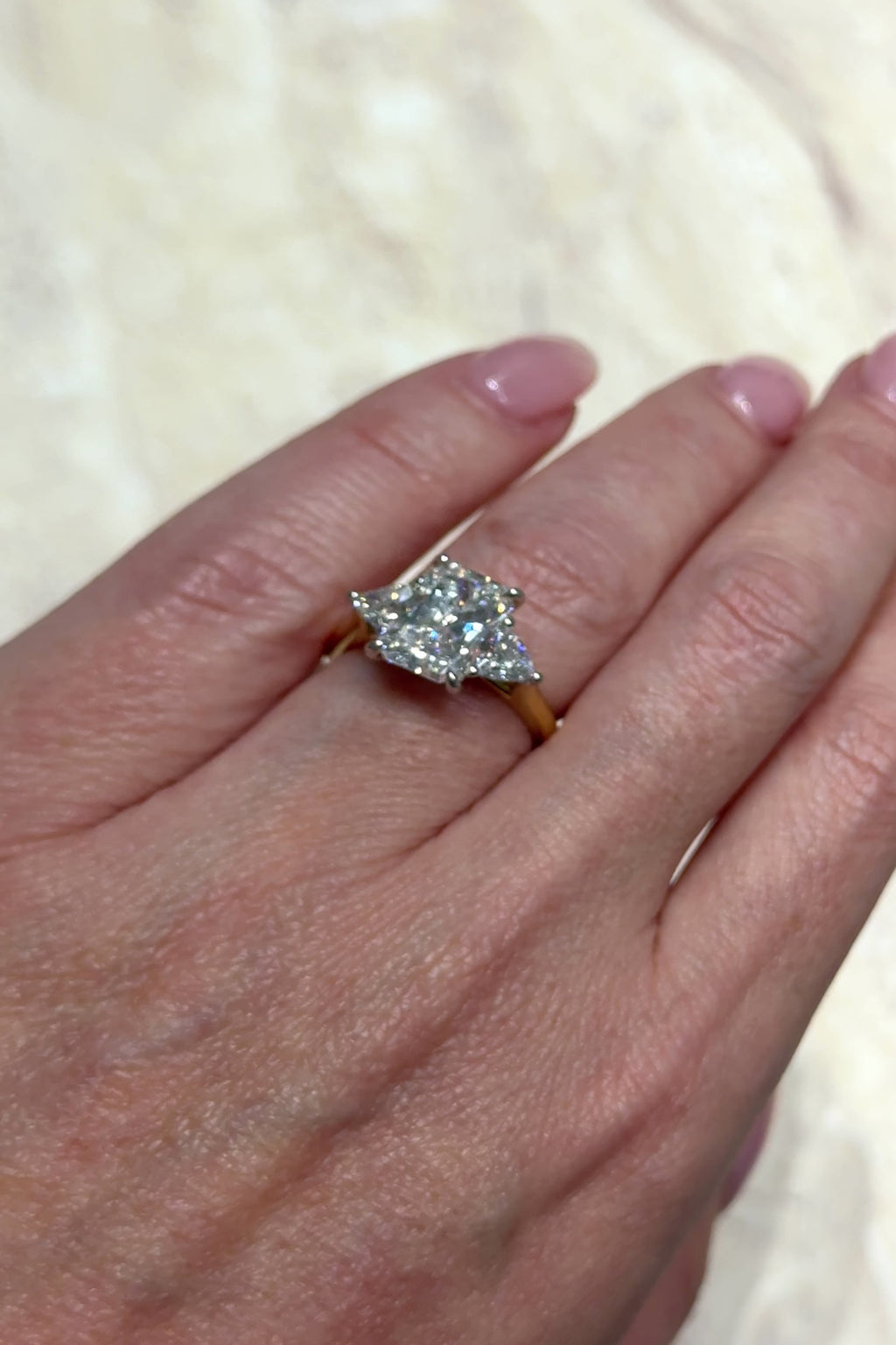 A romantic take on modern brilliance. Elodie features a captivating 2.54ct long radiant-cut lab-grown diamond, its faceted light amplified by a pair of lab-grown trilliant-cut diamonds that bring balance and fire. Set in white gold to heighten the diamonds’ luminosity and paired with the warmth of an 18k yellow gold band, this design embodies symmetry, breathtaking sparkle, and timeless elegance.