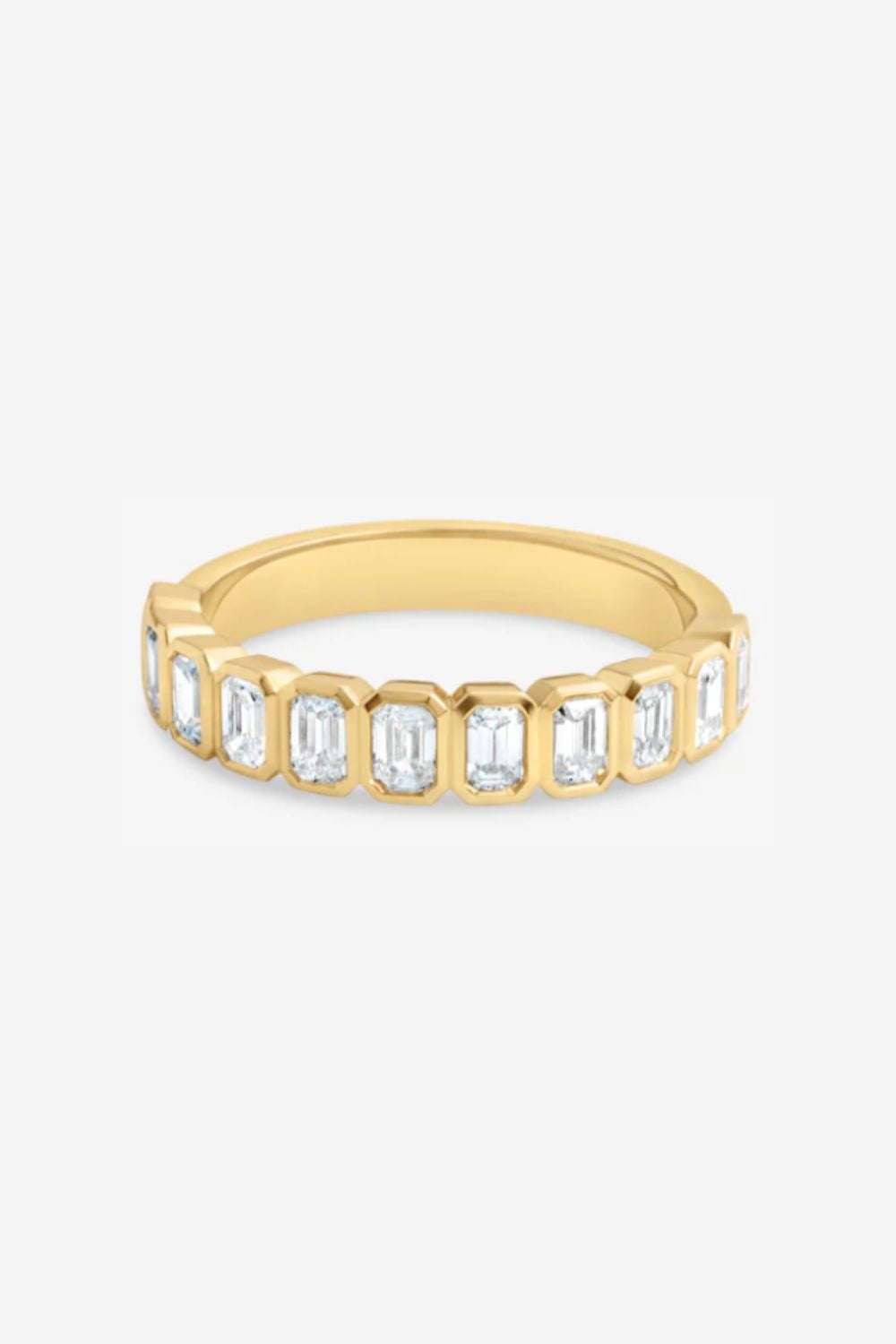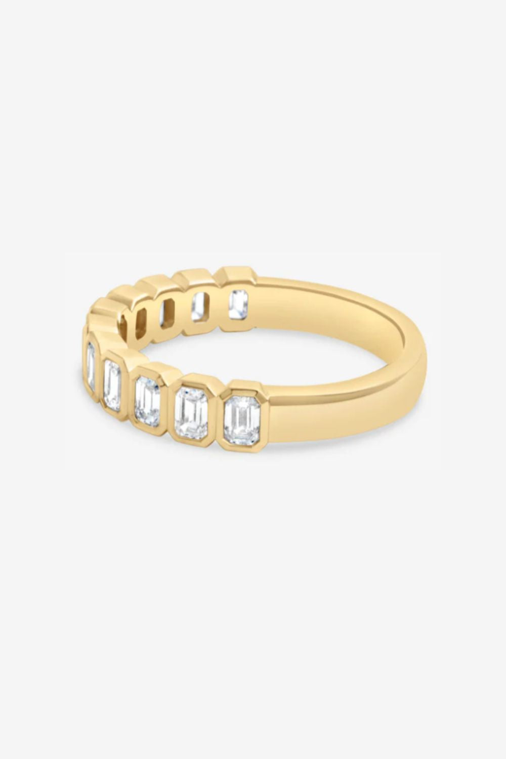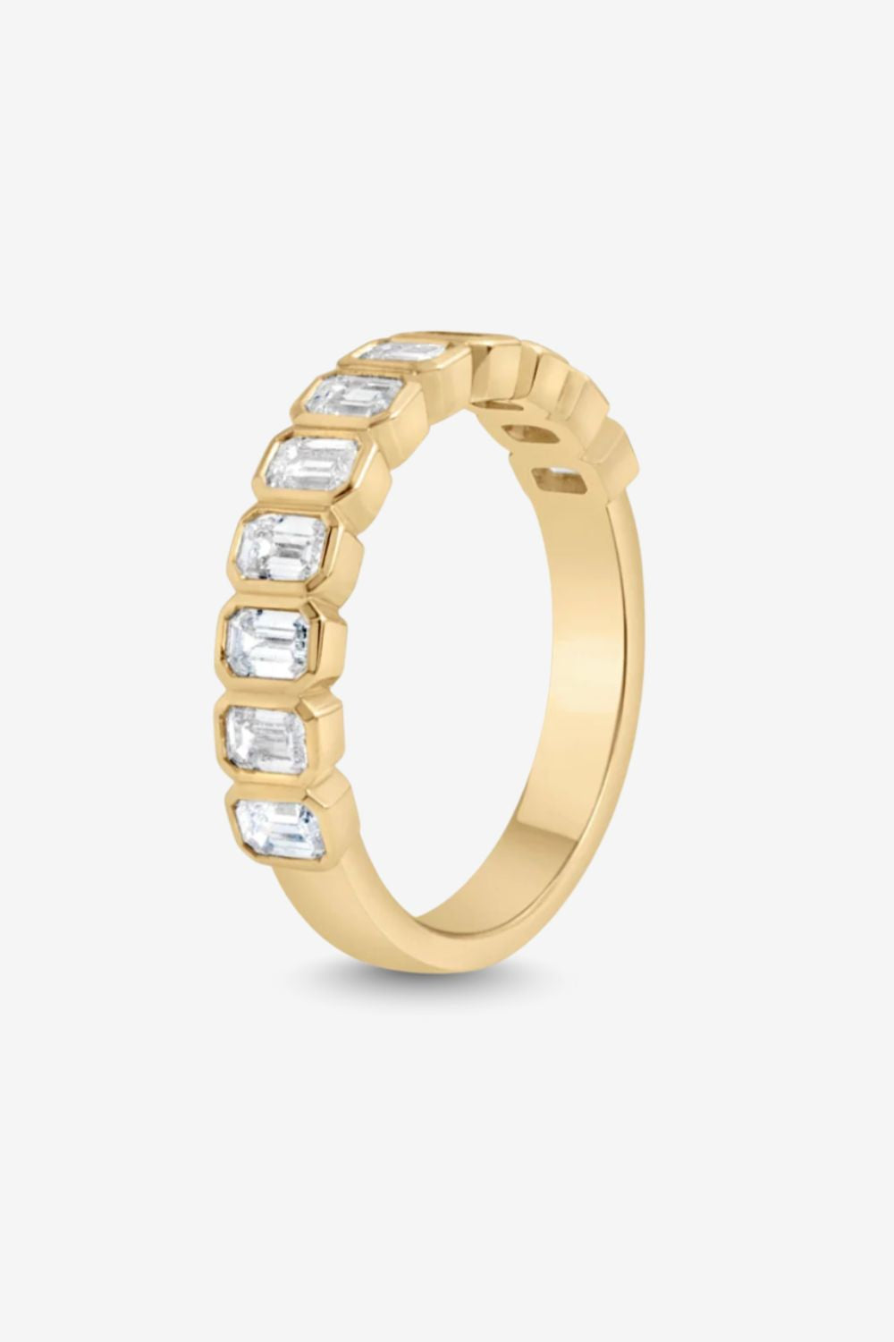 Emerald-cut diamonds sit in a rhythmic sequence, each bezel-set in rich 18k yellow gold for a bold yet wearable silhouette. With 0.90ct of lab-grown diamonds graded D/VVS, this ring feels both architectural and fluid — designed to stand alone or pair effortlessly with your engagement ring.
